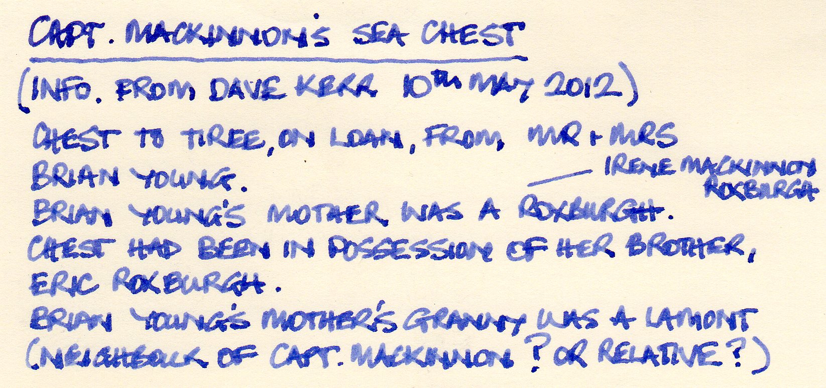 Large wooden chest thought to belong to Captain Donald MacKinnon, Heanish, captain of the tea clipper ‘Taeping’, which sailed to victory in the Great Tea China Tea Race of 1866. Includes a note describing the link between the chest’s current owners, Mr & Mrs Brian Young, and the Captain. Brian Young’s mother, Irene MacKinnon Roxburgh, was a descendent of Captain Angus Lamont and Effie MacKinnon, who was Donald MacKinnon’s sister.