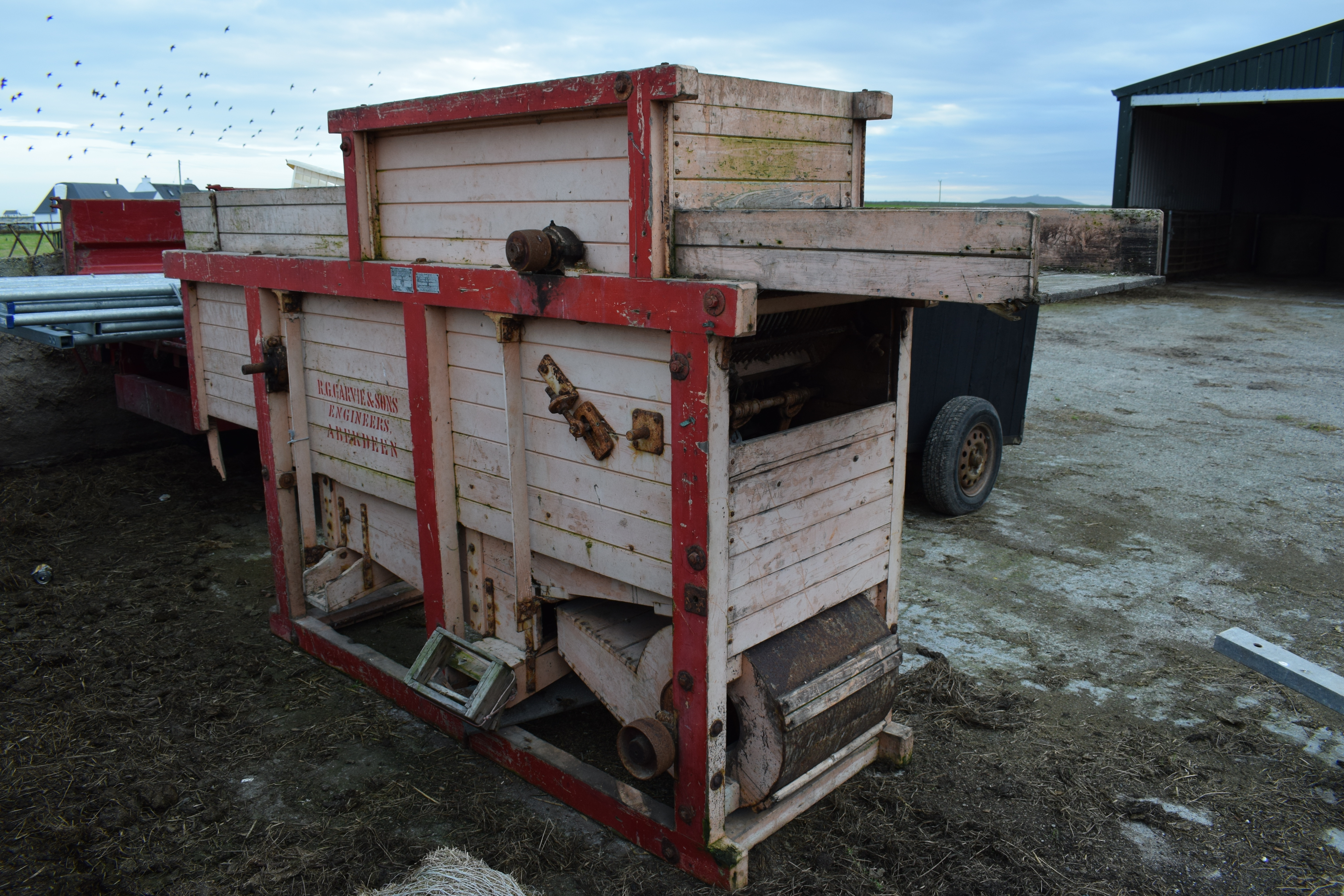 Colour photograph of an old threshing machine made by R.G. Garvie & Sons, Engineers, Aberdeen in the 1920s or 1930s, belonging to Hugh Archie MacCallum, Whitehouse. The machine measured around 2 metre tall x 2 metre long x 1 metre wide, and was used to separate the edible part of the grain from the chaff. Photographed in 2016.