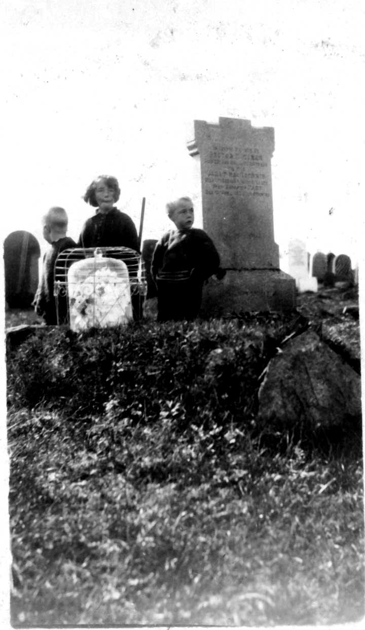 Black and white photograph of children in Kirkapol graveyard.