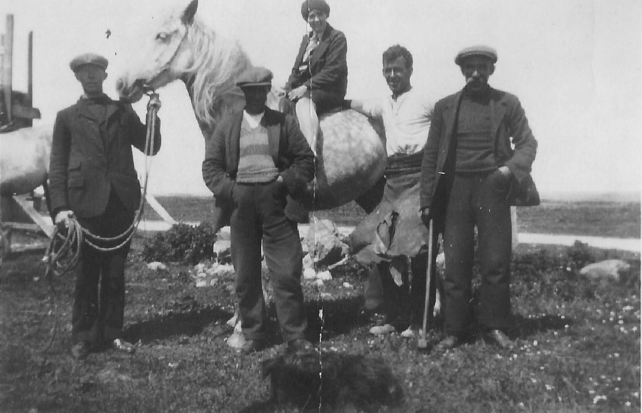 2003.111.1 Leave a ReplyBlack and white photograph taken at Vaul in 1933.Vaul in 1933. L-R: Duncan MacKinnon, Lodge Farm; Donald MacLean (Domhnall Sheumais); Margaret Doig; unknown; unknown.Object DetailsOther Number: A197