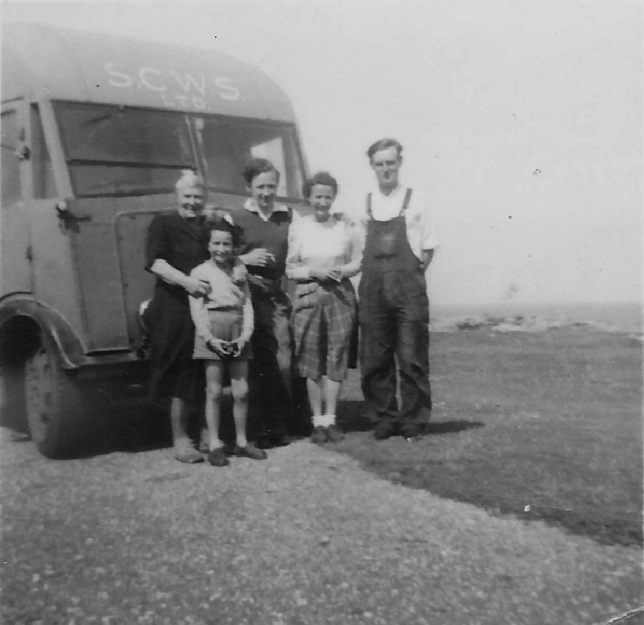 The co-op van at Vaul in the 1940s. L-R: Catriona MacKinnon; Margaret Doig; Lorna and Morag Lee; Neil MacNeill (Cathy MacNeill`s husband).