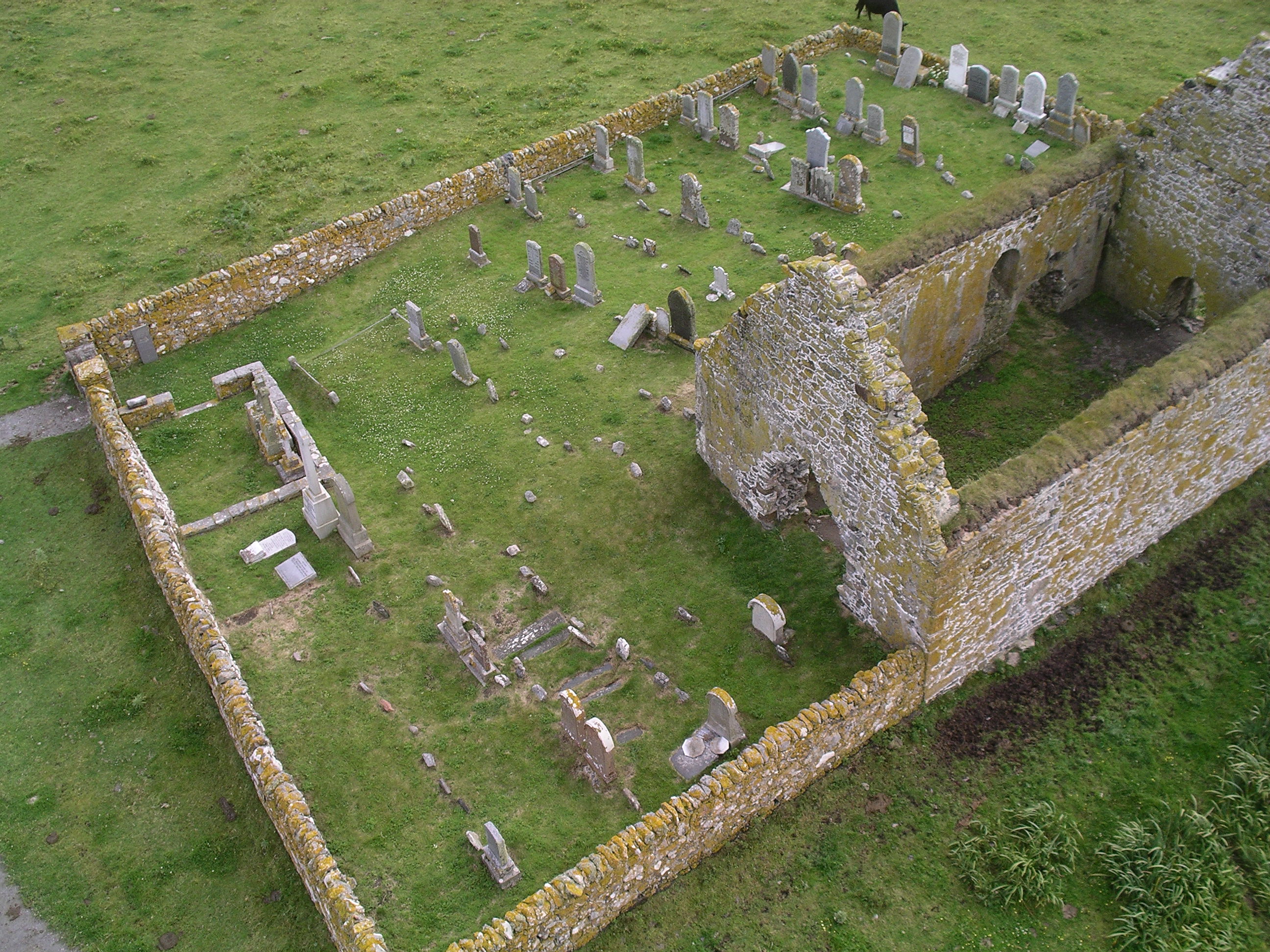 The Old Parish Church and graveyard at Kirkapol photographed by James Gentles in July 2003 using a remote controlled camera on a kite.