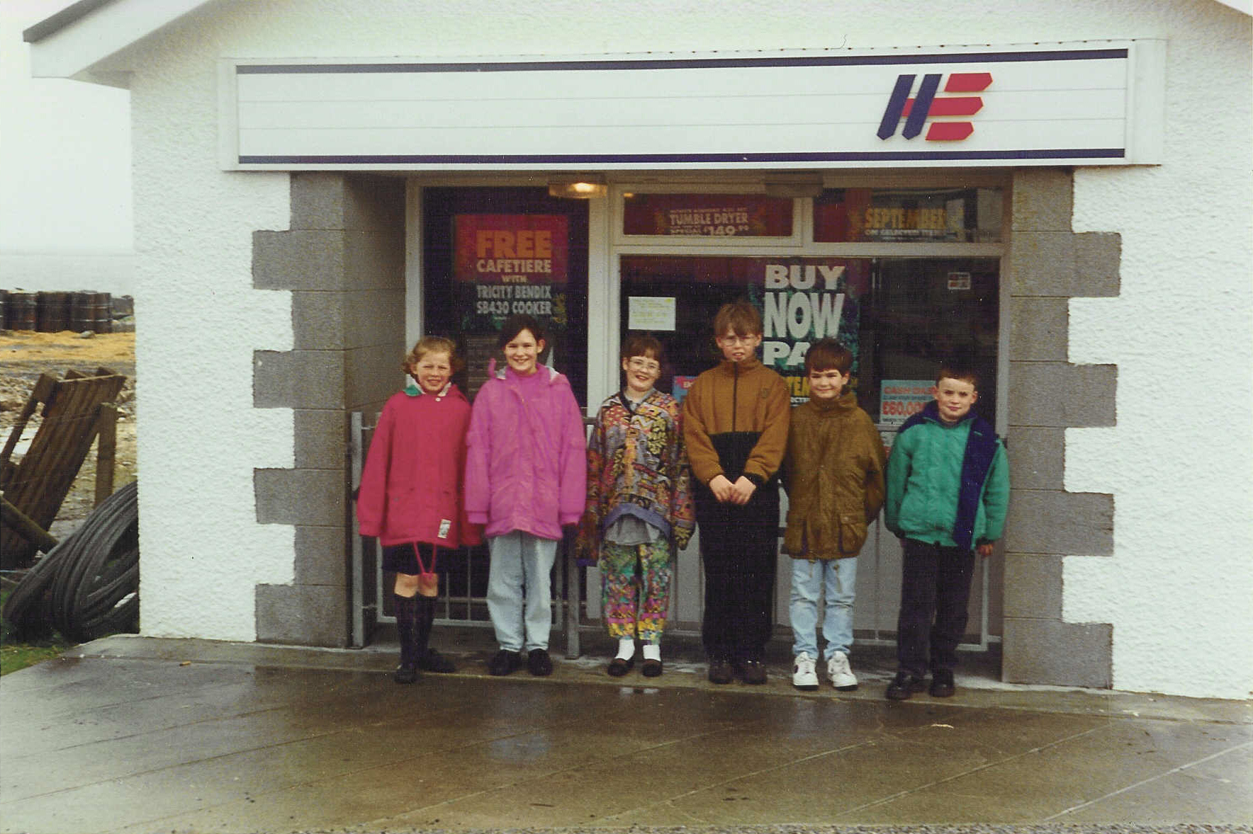 Pupils from P6/7 outside the Hydro-Electric showroom at Scarinish in 1994-5.
