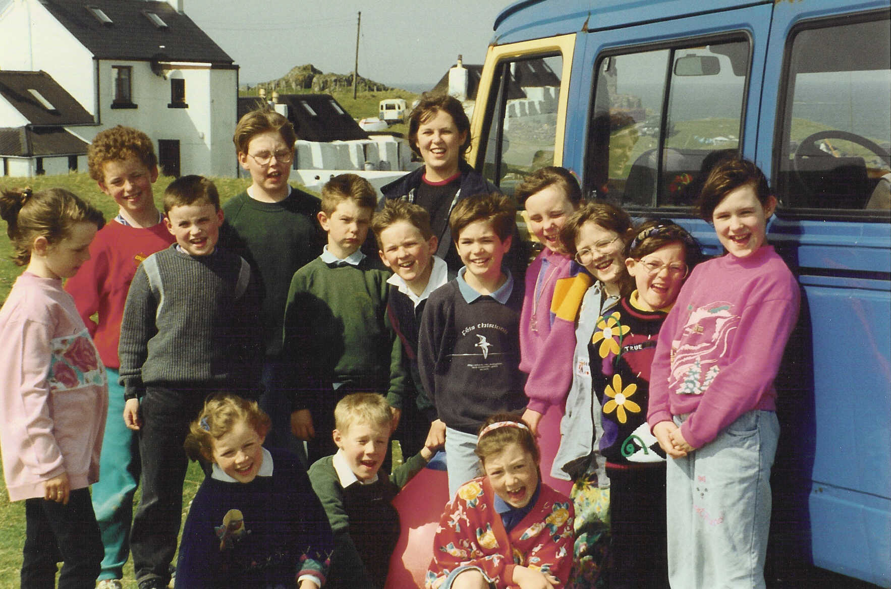 P6/7 with classroom assistant Jan Paterson with the school minibus outside Tiree High School in 1994-5.