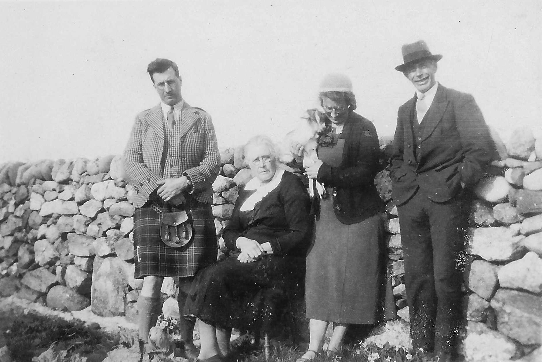 The Croft, Balevullin in the 1930s. L-R: Veterinary Duncan MacLean (1904-1958); possibly his mother; his sister Mary MacLean with a young goat; Willie MacLean of Balevullin.