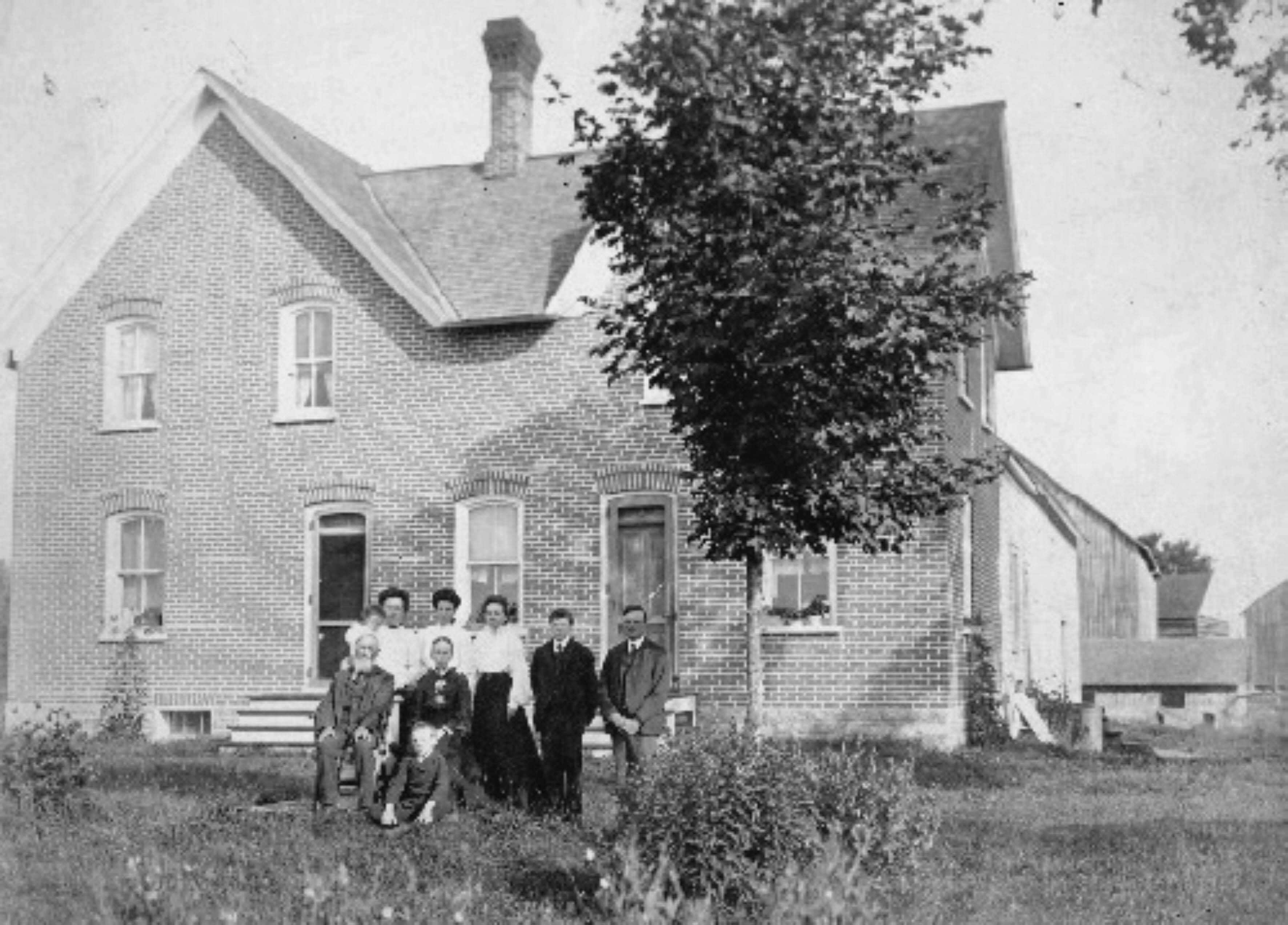 The MacPhadden homestead in Kenyon Township, Glengarry County, Ontario in 1904. The land was first settled by Alexander MacPhadden, who was baptised in 1790, the son of Charles MacPhaiden of Caoles and his wife Christy MacPhail. According to oral history Alexander emigrated to Canada around 1806 in the company of MacIsaacs and MacDonalds, at first living at Glen Donald in southern Ontario. In 1809 he leased Lots 11 and 12 of Concession 14 in Kenyon Township, which he purchased in 1852. This photo pictures his son John with his family in front of their fine brick house built around 1895. The family ran a.mixed dairy farm and maple syrup orchard.