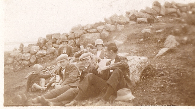 Black & white photograph of a group of six young adults and a boy lounging on a rocky hillside on Tiree around the 1930s.