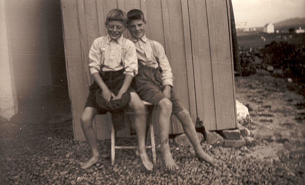 Black & white photograph of two bare-foot boys sitting on a stool outside a barn around 1950. The boys could be twins Gordon and Donald from the MacNeil / Kennedy family of Balevullin/Balephuil. From a collection of photographs from the house of Ellen Kennedy (nee Eilidh MacNeil), Balevullin.