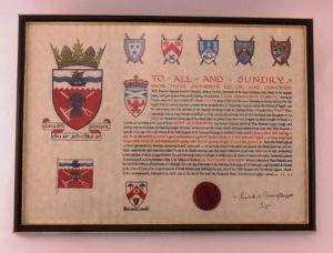Rolled original inscription of the Tiree Community Council crest on modern vellum, 1987. Includes burgundy cardboard storage tube. Appears similar to reprint: