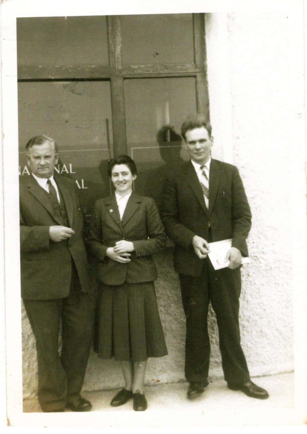 A relief banker, possibly Angus Macpherson from Skye, Mary Mackinnon, Park House and John Macleod of Balemartine. The bank name appears to be National Commercial so 1959 or later. The bank was National Bank before then.