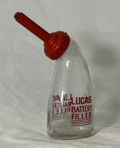 A Lucas battery filler. A distilled water bottle for topping up accumulator batteries.