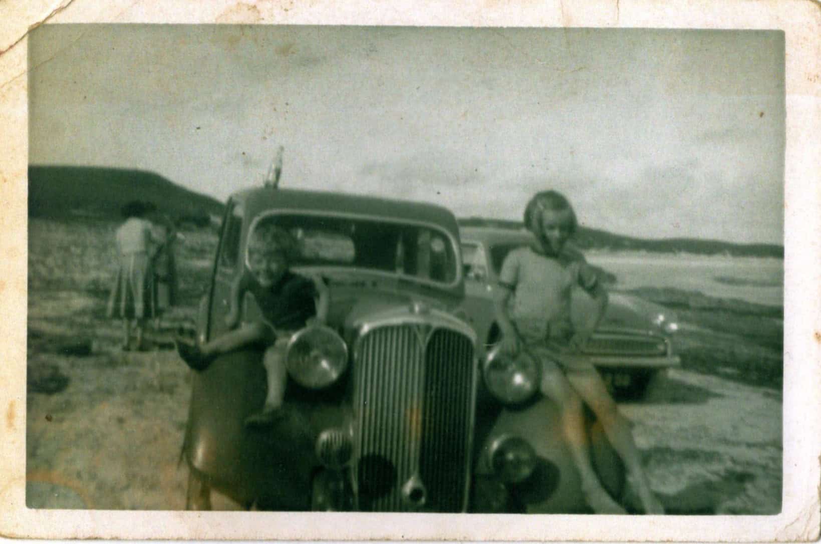 “A picnic on the beach with the Becks. Robin and I are sitting on the car. My parents arrived in Tiree in the same week as the Becks and met in the Scarinish Hotel while we were all waiting for our furniture containers to arrive on the cargo boat.” by the donor of this photograph and others in this collection at 2025.53 Isabel Beaton.