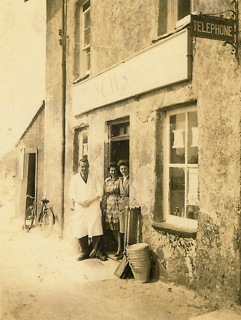 Port an Tobair, 1950. L-R: Donald MacDonald, Allan MacFadyen, Lachie MacDonald, Tilda MacDonald, Archie MacDonald, Lachie MacArthur, Hugh MacFadyen, Duncan MacArthur, all of Balemartine.