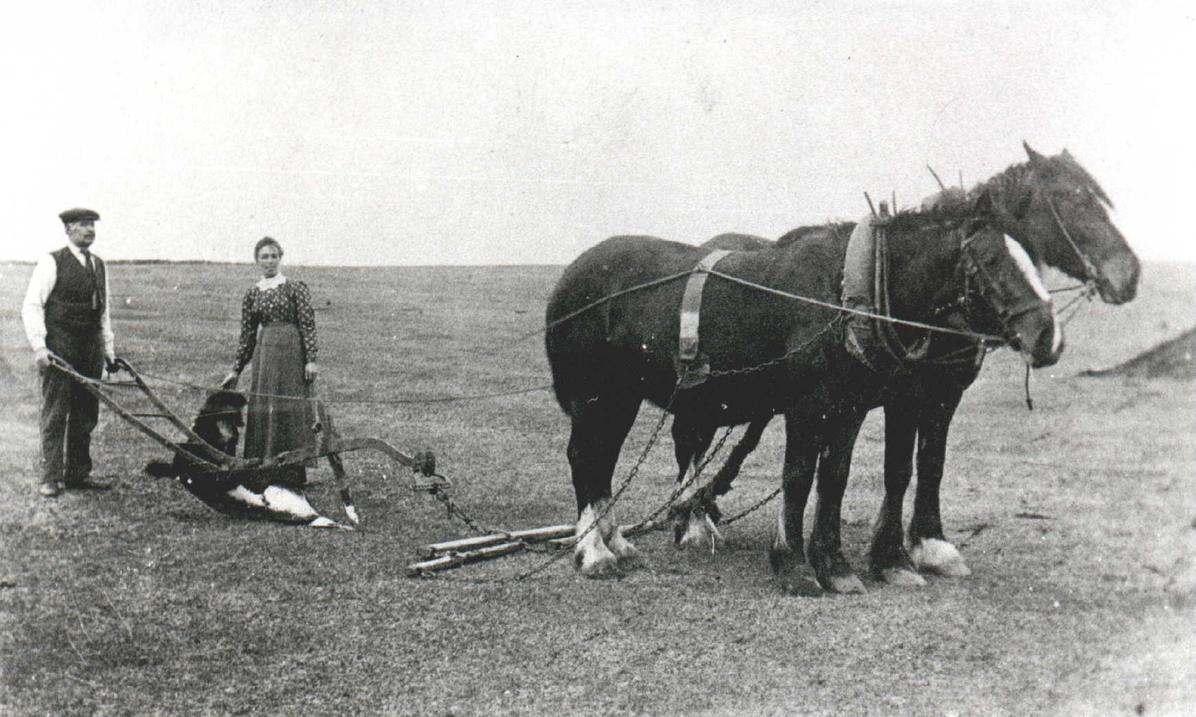 The plough is hitched to two exceptionally well-bred Clydesdales of the Tiree type. Introduced in the 1870s, Clydesdales were crossed with local ponies to produce lighter and faster draught animals for which Tiree was famous in the early 20th century.