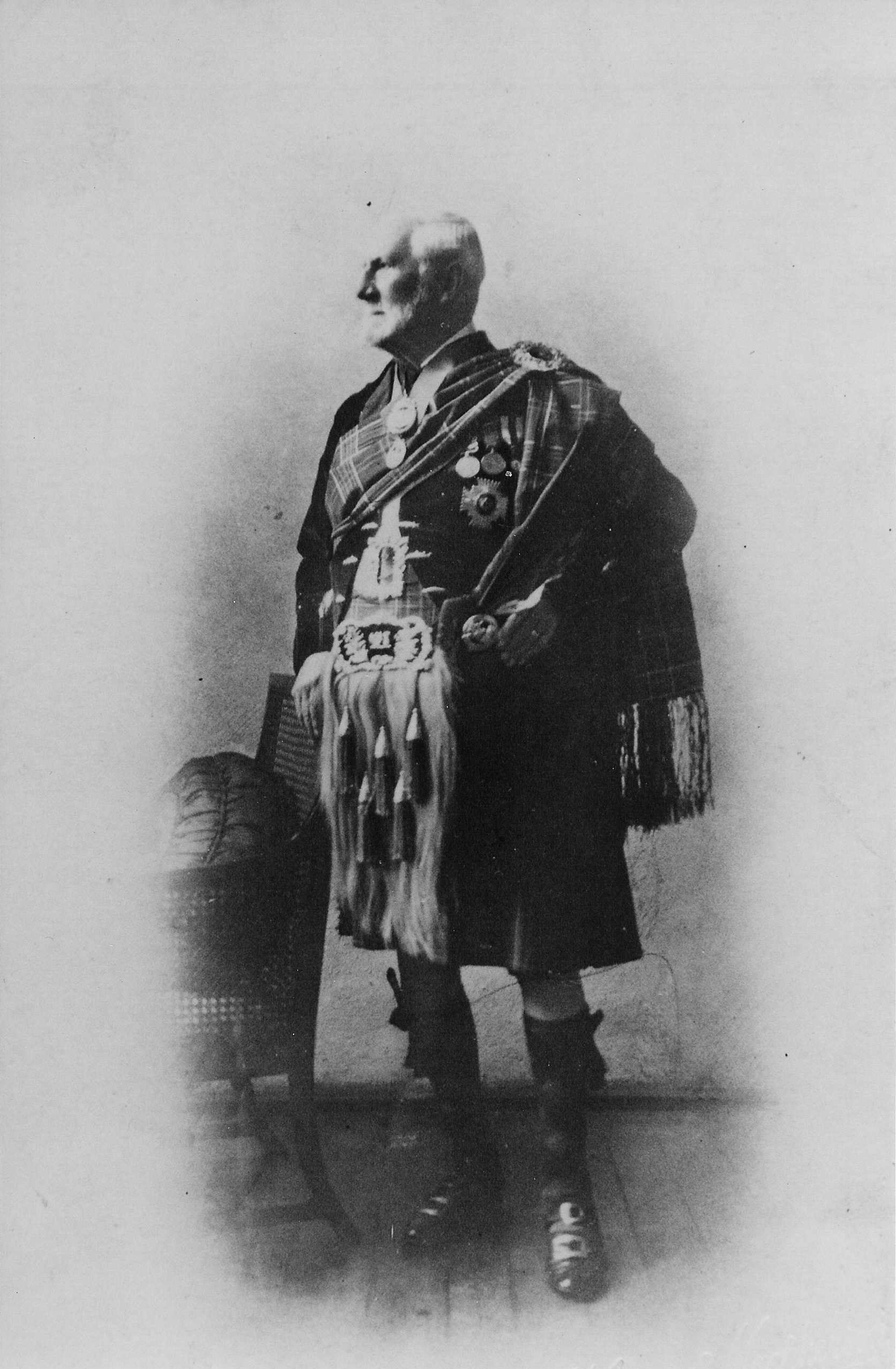 Pipe Major Willie MacLean of Kilcreggan, in full Highland regalia. He led the 1st Cameron Highlanders into Cologne during World War I.