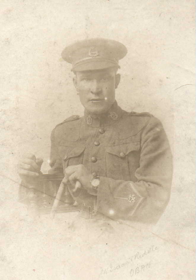 Oval brass keyring 45 mm by 30 mm, stamped on one side with `SCARINISH GAURD ROOM` around the edge and `38` in the centre, and on the other side `W`, an upward-pointing arrow, `D`. In use during World War II. Found on Hough beach by Fiona MacRae.