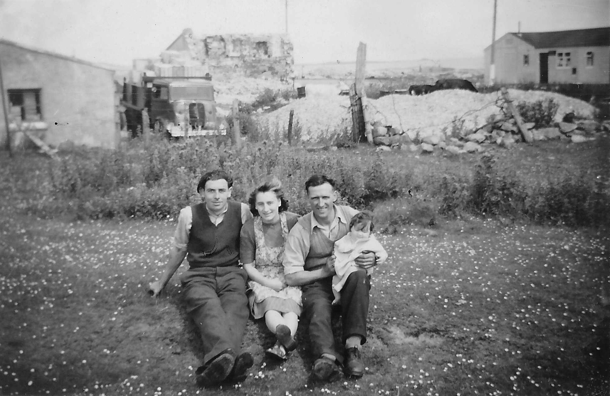 Scarinish in 1951 with the ruins of the Co-op which burnt down in 1948. ‘Taigh na Beairt’ is in background at the right. On the left is Neil MacDonald’s haulage lorry. L-R: Neil MacDonald (Catherine Mary’s husband); Cathy MacNeill of Scarinish; Hugh MacKinnon, brother of Effie Middleton and Donald Hough, and married to Duncanina MacMaster; Teena MacNeill, Cathy’s daughter.