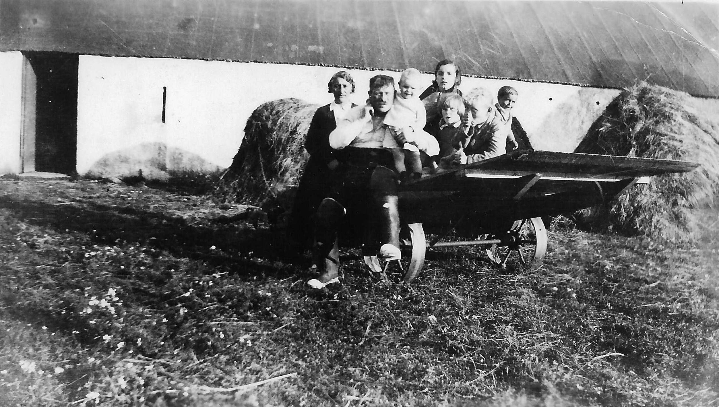 The Paterson family are pictured in 1937 sitting on a rick-lifter outside their steadings at Crossapol. The cart was used to move stùcanan (small stacks of corn) from the fields to an iodhlann, the stackyard behind the house, where about six to eight of them were carefully built into a mulan (corn stack).