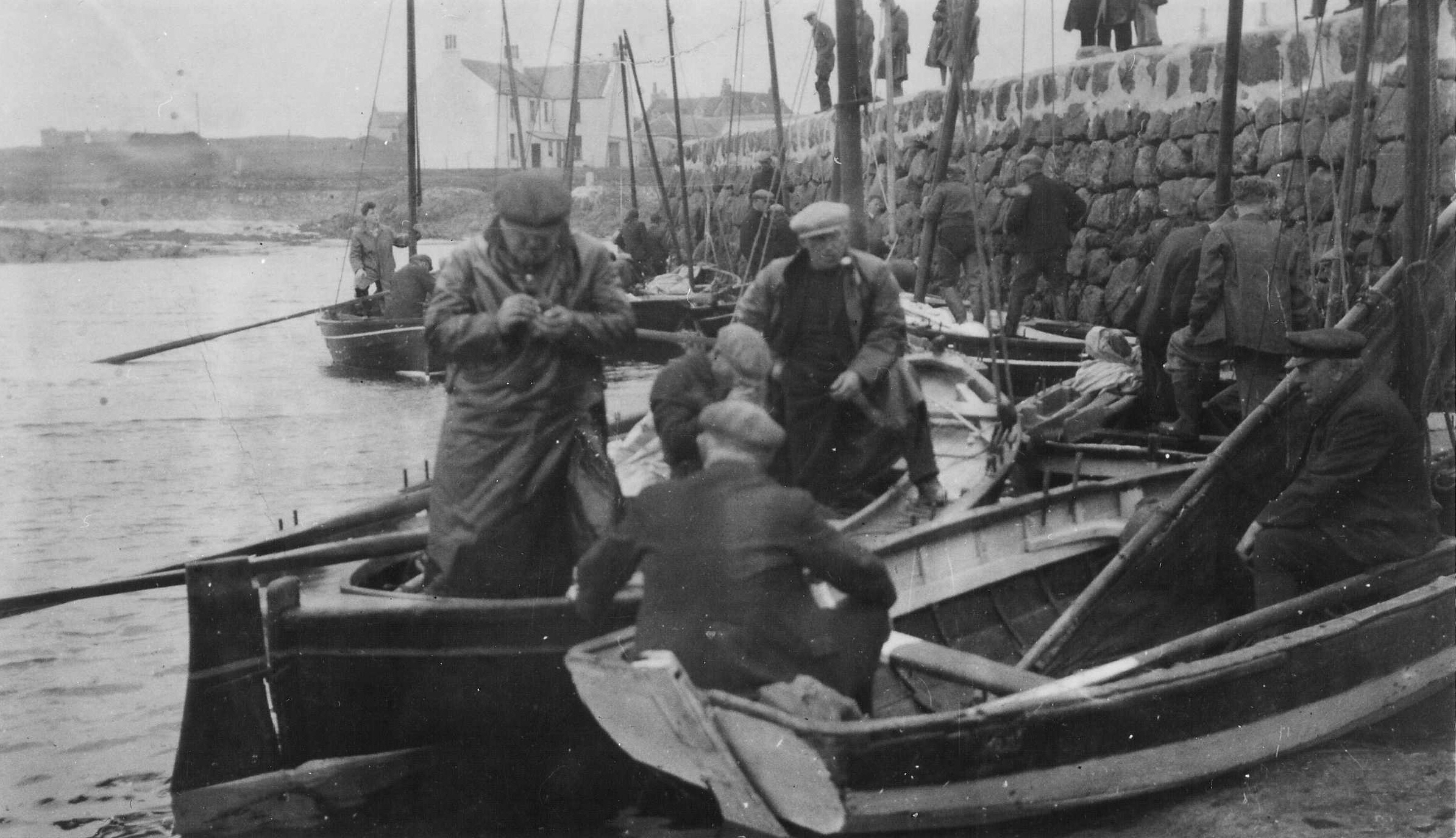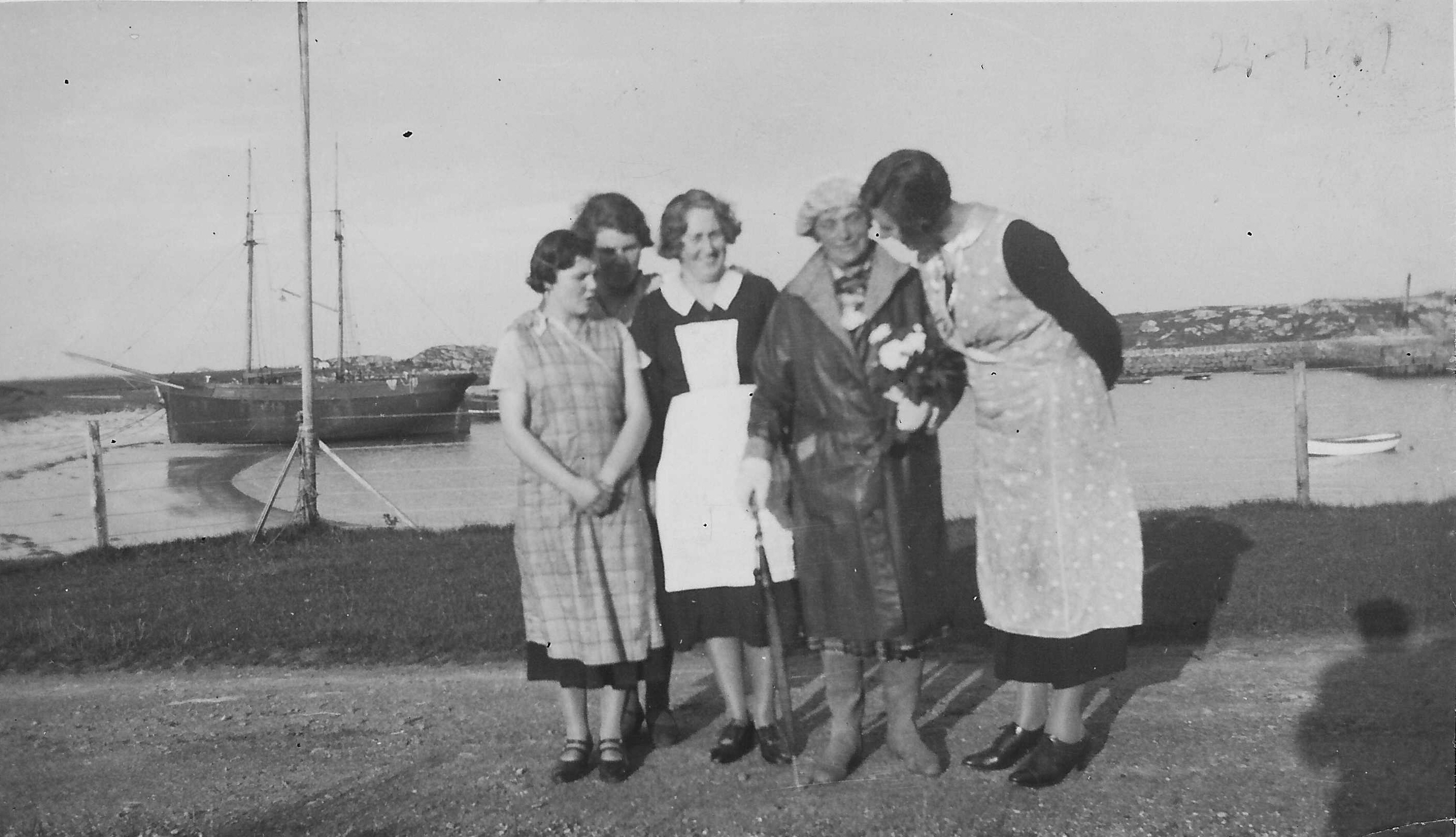 Scarinish harbour with the Mary Stewart in the 1930s. On the extreme right is Chrissie MacDonald of Balemartine who worked in the Scarinish Hotel.