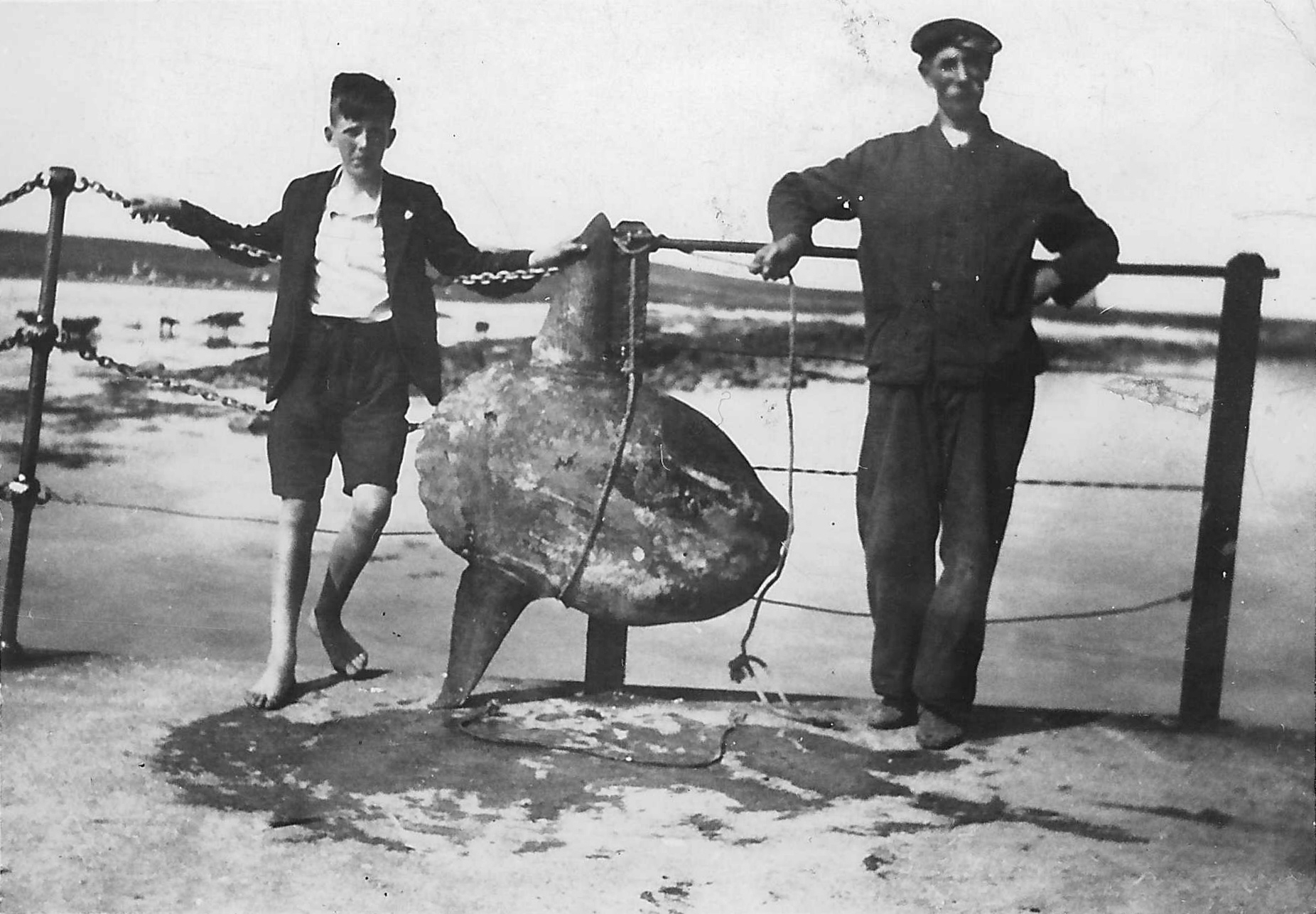 John MacDonald of Heanish and his son Donald were photographed with a sunfish on Gott Bay pier in the late 1920s or early 1930s. The ocean sunfish, Mola mola, is the most massive bony fish in the world and can grow over three metres in length.