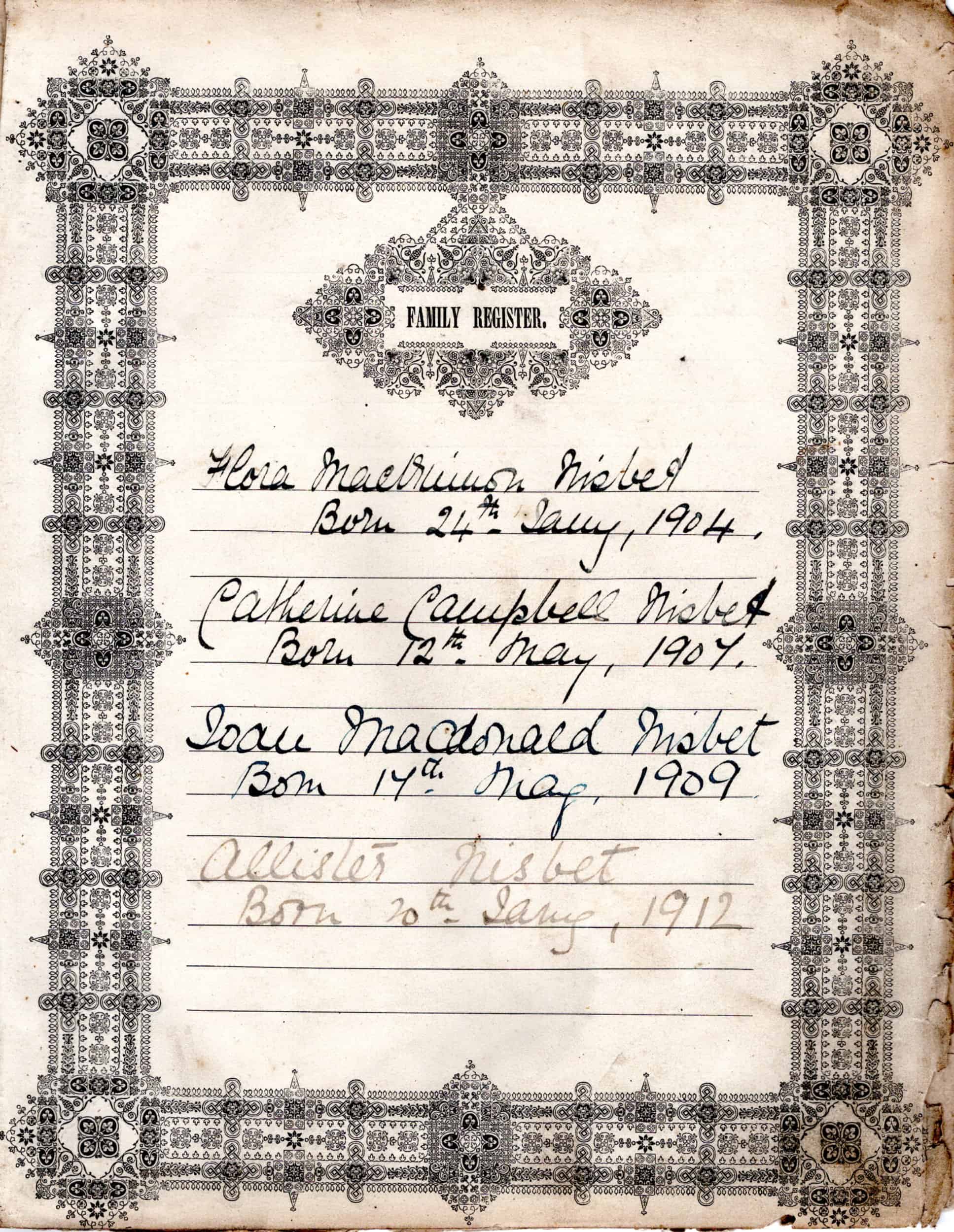 Large, leather-bound Brown’s Bible (1868) belonging to the Nisbet family of Heanish. Handwritten on the inside, on a Family Register page, are the names and dates of birth of the Nisbet children: Flora, Catherine, Joan, Allister and Robert.