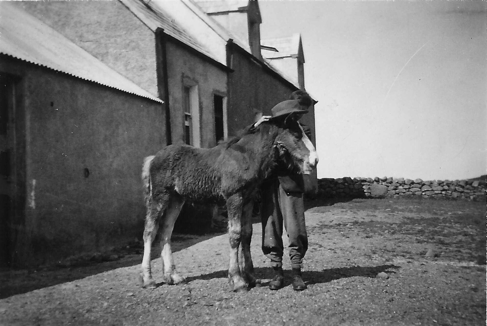 Hector J. C. Campbell with a Clydesdale foal at Melness in Cornaigbeg in the mid-1940s.