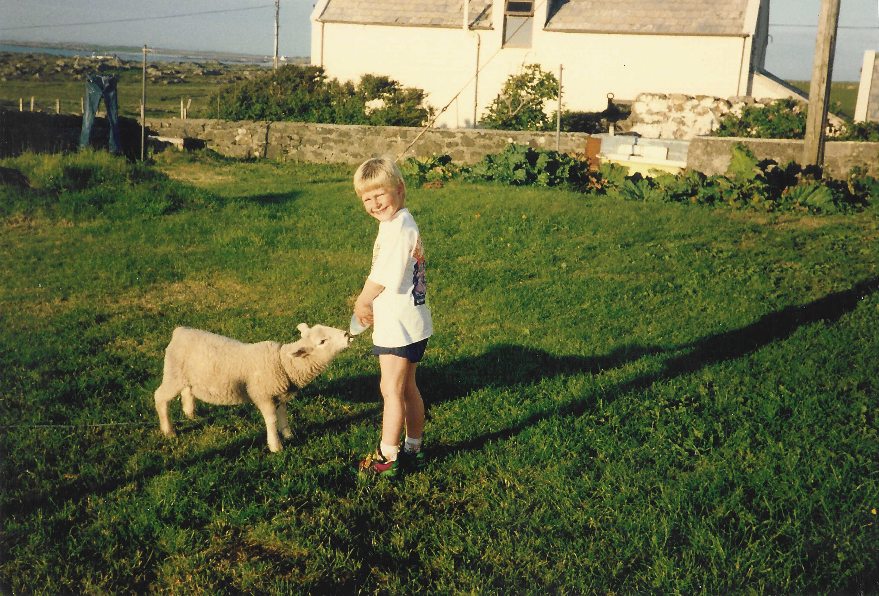 Photograph of John Campbell feeding a pet lamb in Cornaigbeg in 1991.