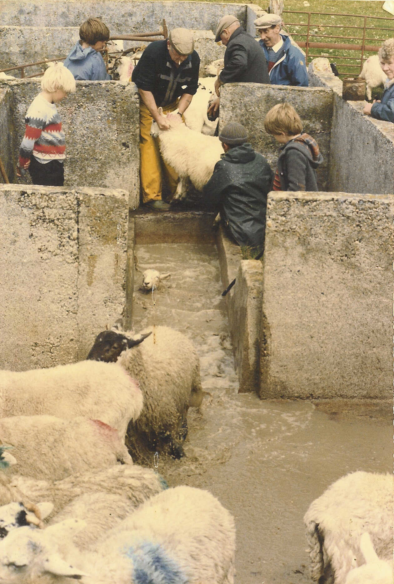 This photograph shows sheep being put through a dip-bath at Balephuil in 1987. Twice-yearly dipping was compulsory up to 1989 in an effort to eradicate scab, a disease caused by a parasitic mite that can result in severe loss of condition and death, especially of lambs. Dipping also treated other parasites such as blowfly maggots and ticks.