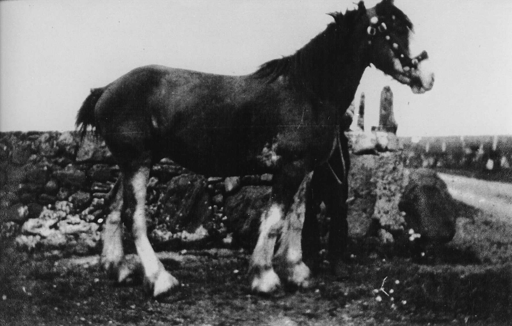 John MacLean of the Brae, Cornaigbeg, with a Clydesdale stallion, probably photographed in the 1930s. The harness went through the belt around the stallion and was used to control him.