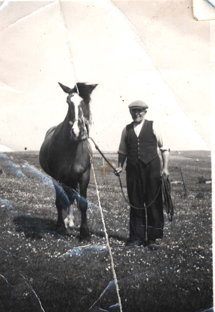 Alexander Campbell of Moss with his horse and cart taken in Moss in the 1930s. (Grandfather of Nancy MacKechnie, Crossapol and Maggie Campbell`s father-in-law)