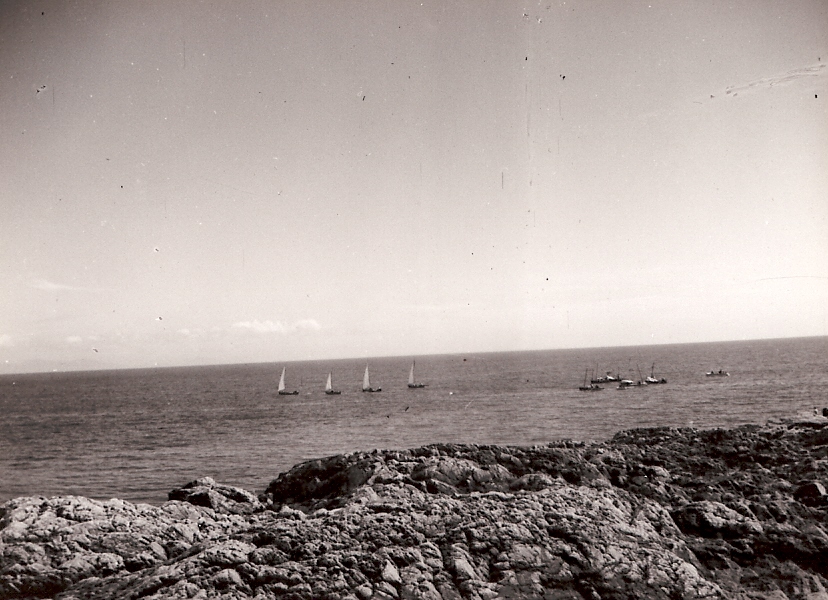 Colour photograph of three dipping lug-sail boats racing under sail at the Tiree Regatta around 1970 (with a forth boat in the background heading the other way).