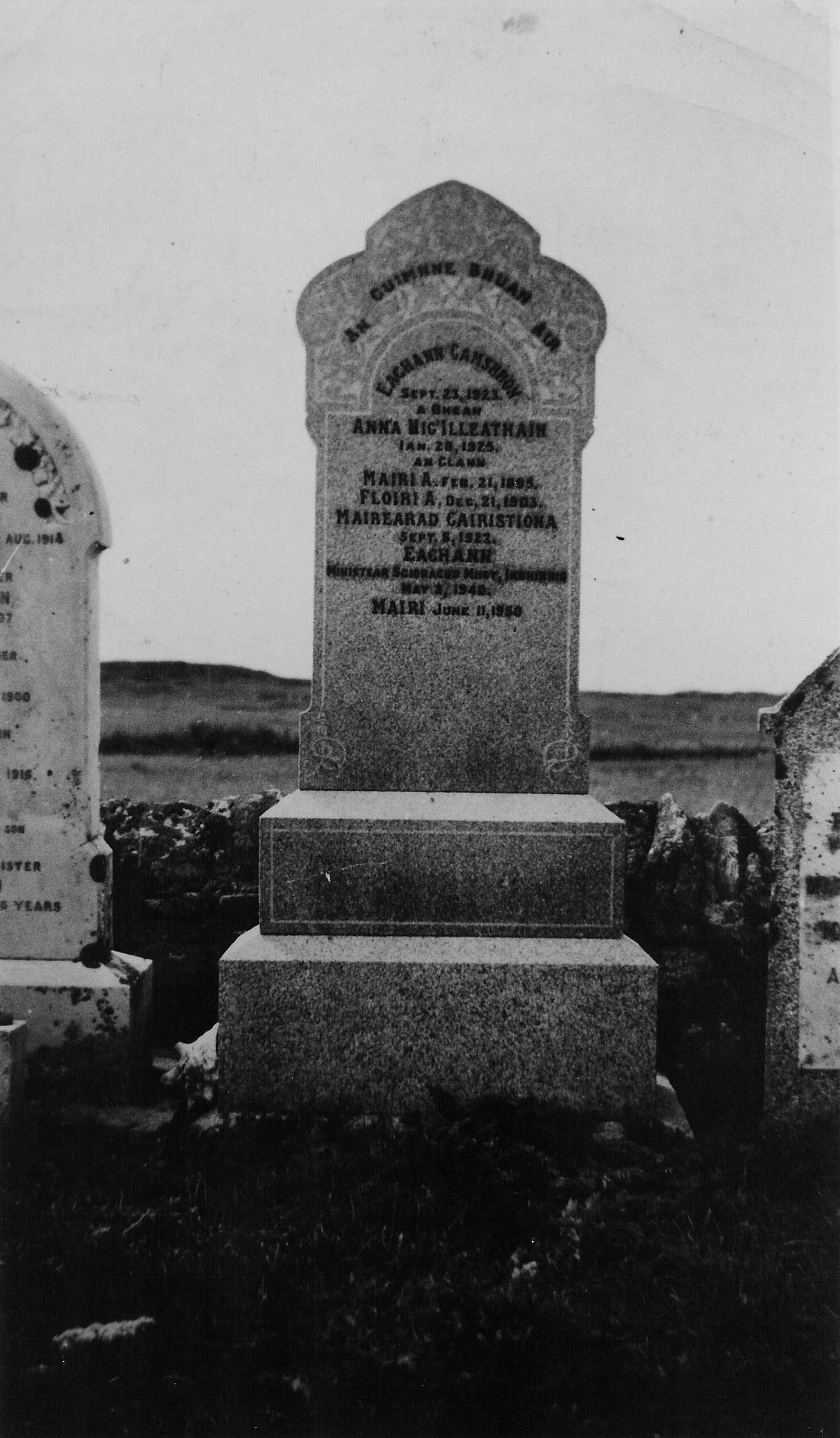 The gravestone of Hector Cameron (d. 23/9/1923) and his wife Anna MacLean (d. 28/1/1925) and their children Mairi Anna, Flora, Margaret Christina, the Rev. Hector (co-author of the Tiree & Coll Handbook) and Mairi.