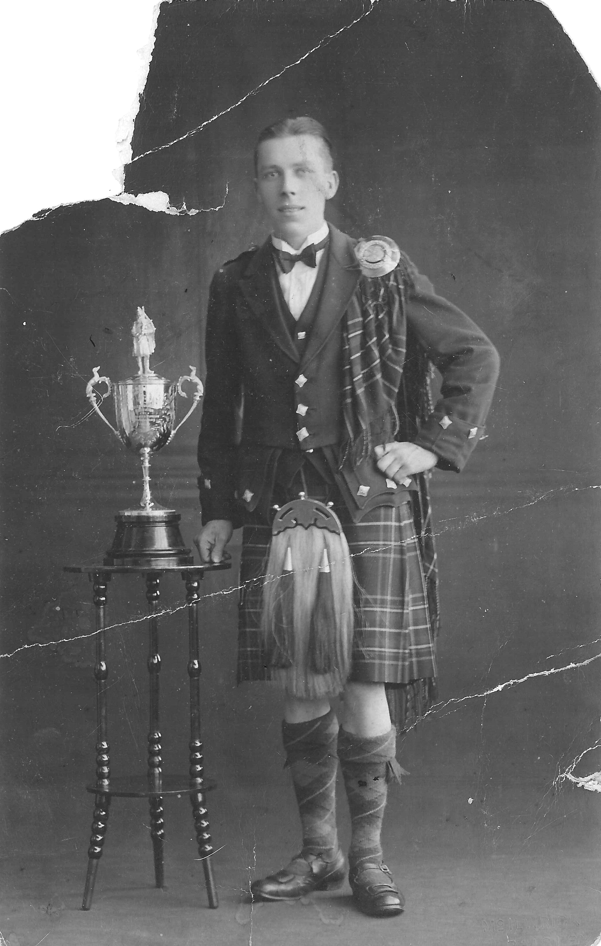 Archie MacEachern of Creag Mhor in Cornaigbeg, with the cup he won as first prize in a piping competition at the Paisley Highlanders in 1933.