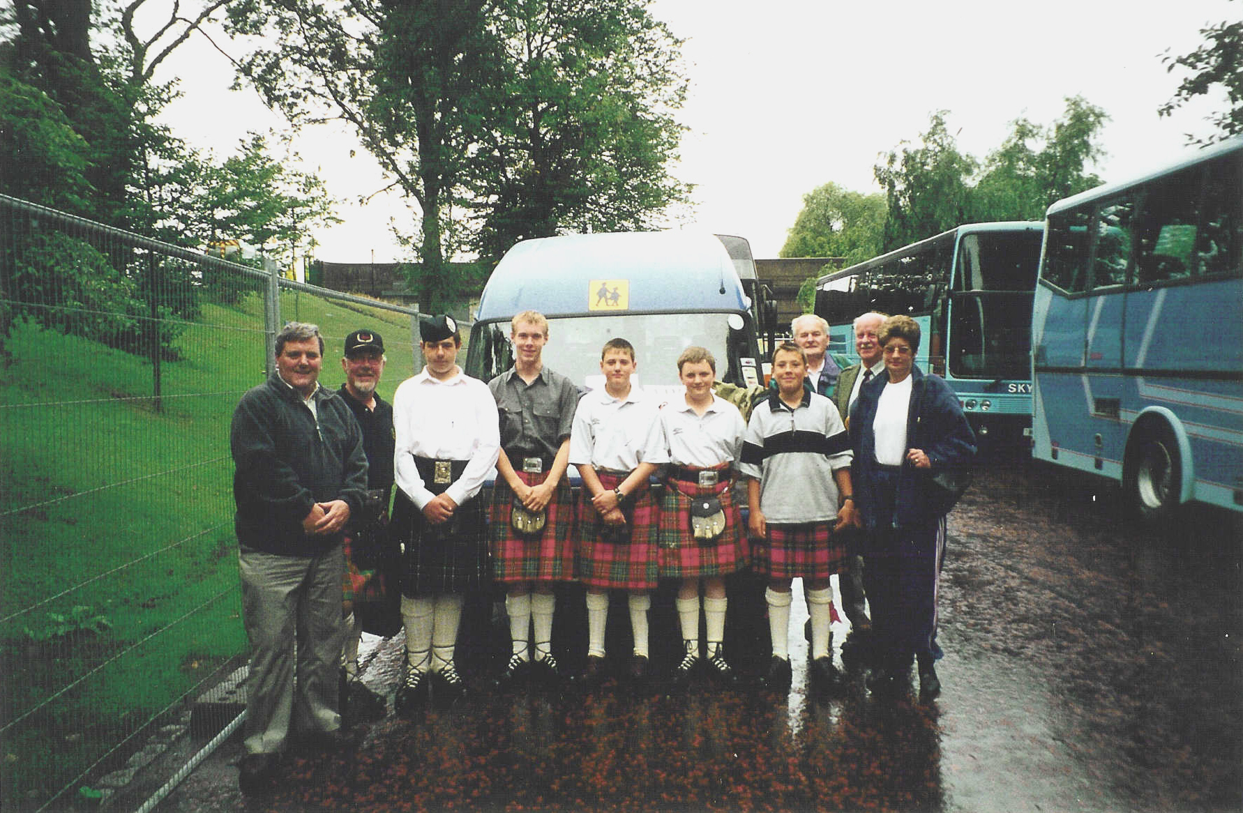 Young pipers at Glasgow Green for the World Pipe Band Championships, photographed by Mary MacLean of Scarinish in 2001. L-R: Iain MacKinnon, Balephetrish; Iain MacDonald of Lenzie and Balvullin; Alexander MacLean, Balinoe; David Hunter, Cornaigmore; brothers Niall and Kenneth MacKinnon, Balephetrish; Andrew MacKinnon, Kilsyth; Angus MacLean, Scarinish; Robert Beck, Ruaig; Rena Goldie, Balinoe.