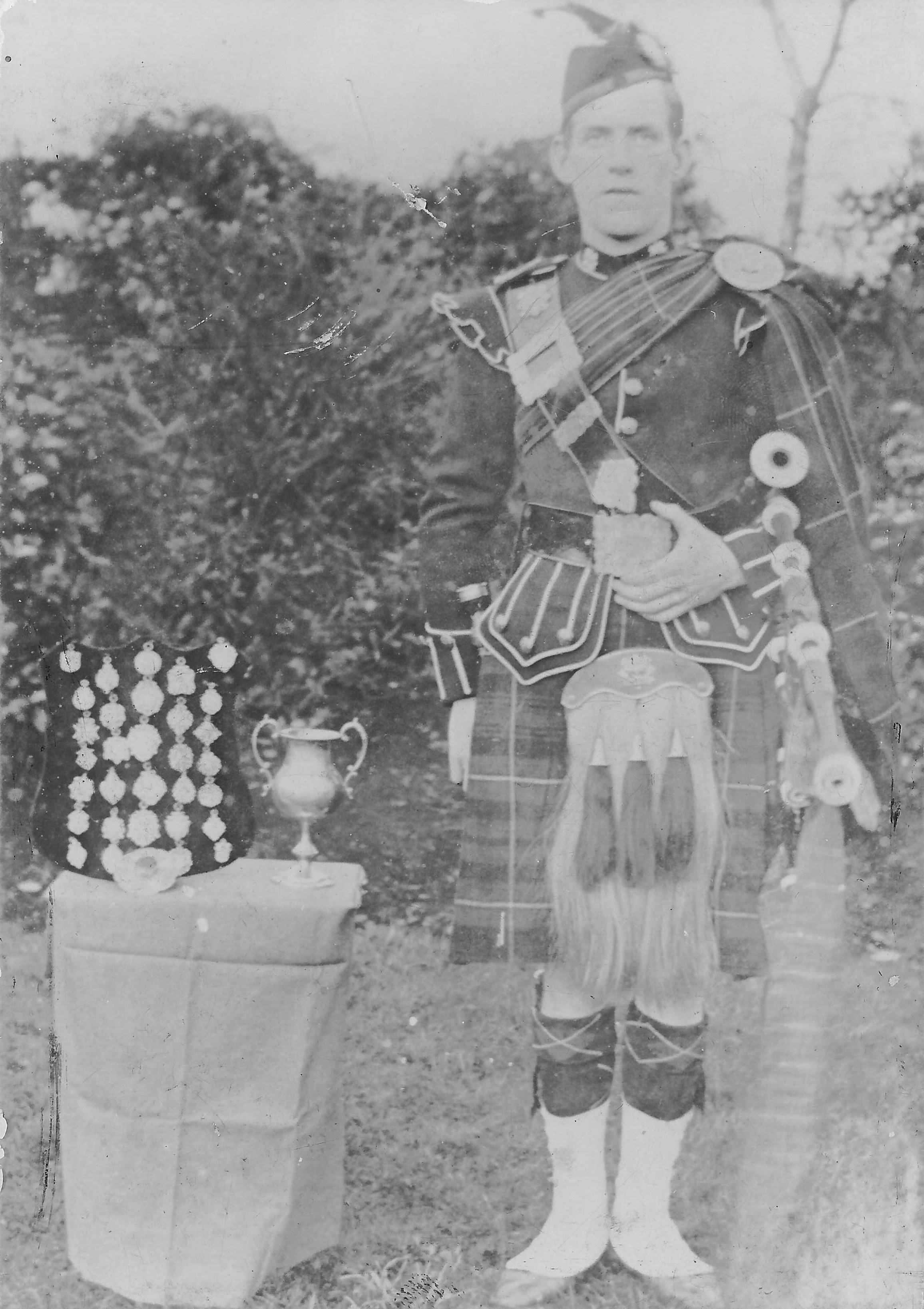 Black and white photograph of the Tiree pipe band, from Annabella MacNeill`s collection.