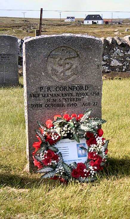The grave at Soroby cemetery of Able Seaman P. R. Cornford from H.M.S. Sturdy who was lost at Sandaig in October 1940, photographed by Gordon Scott in September 2005.