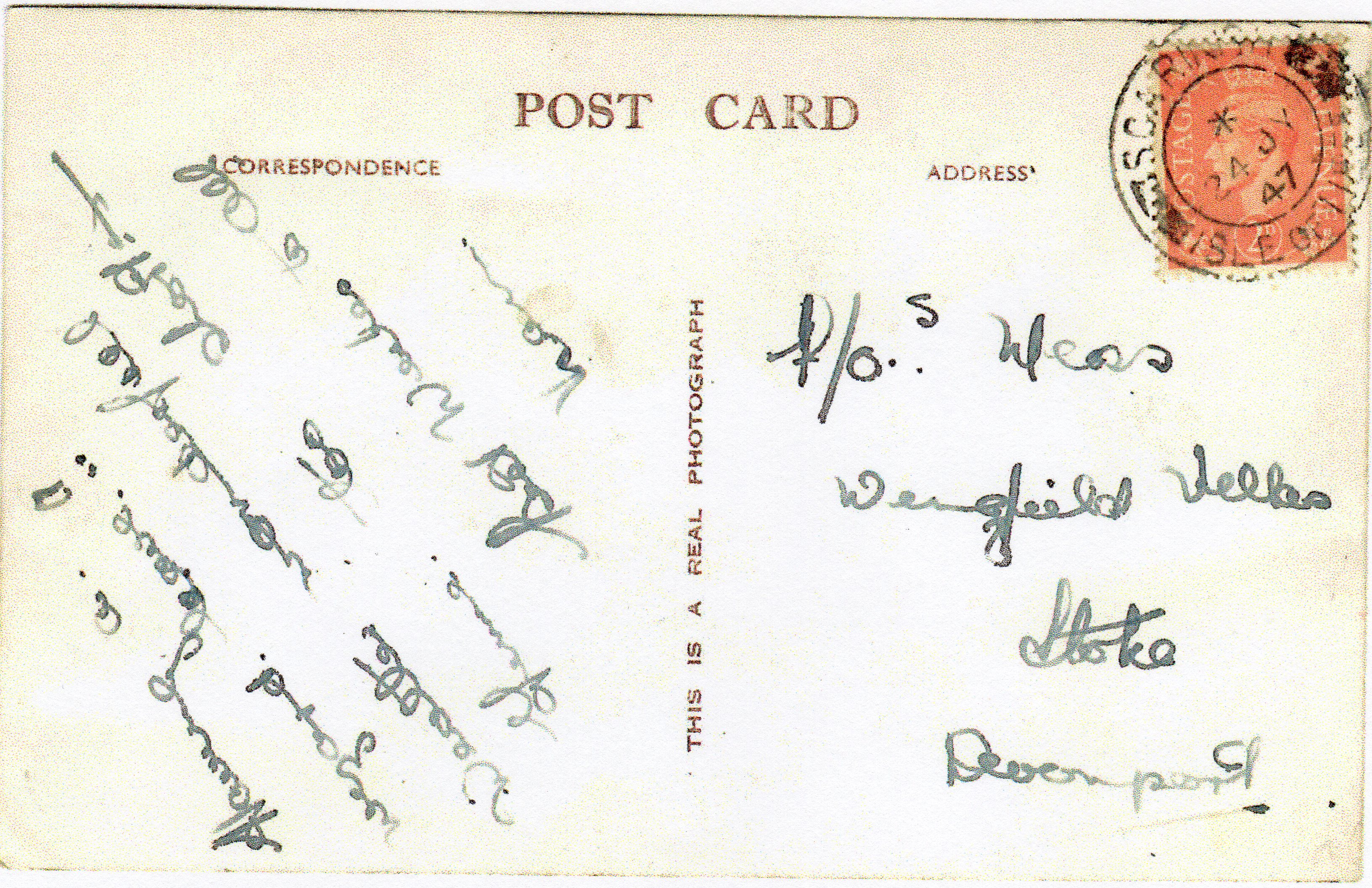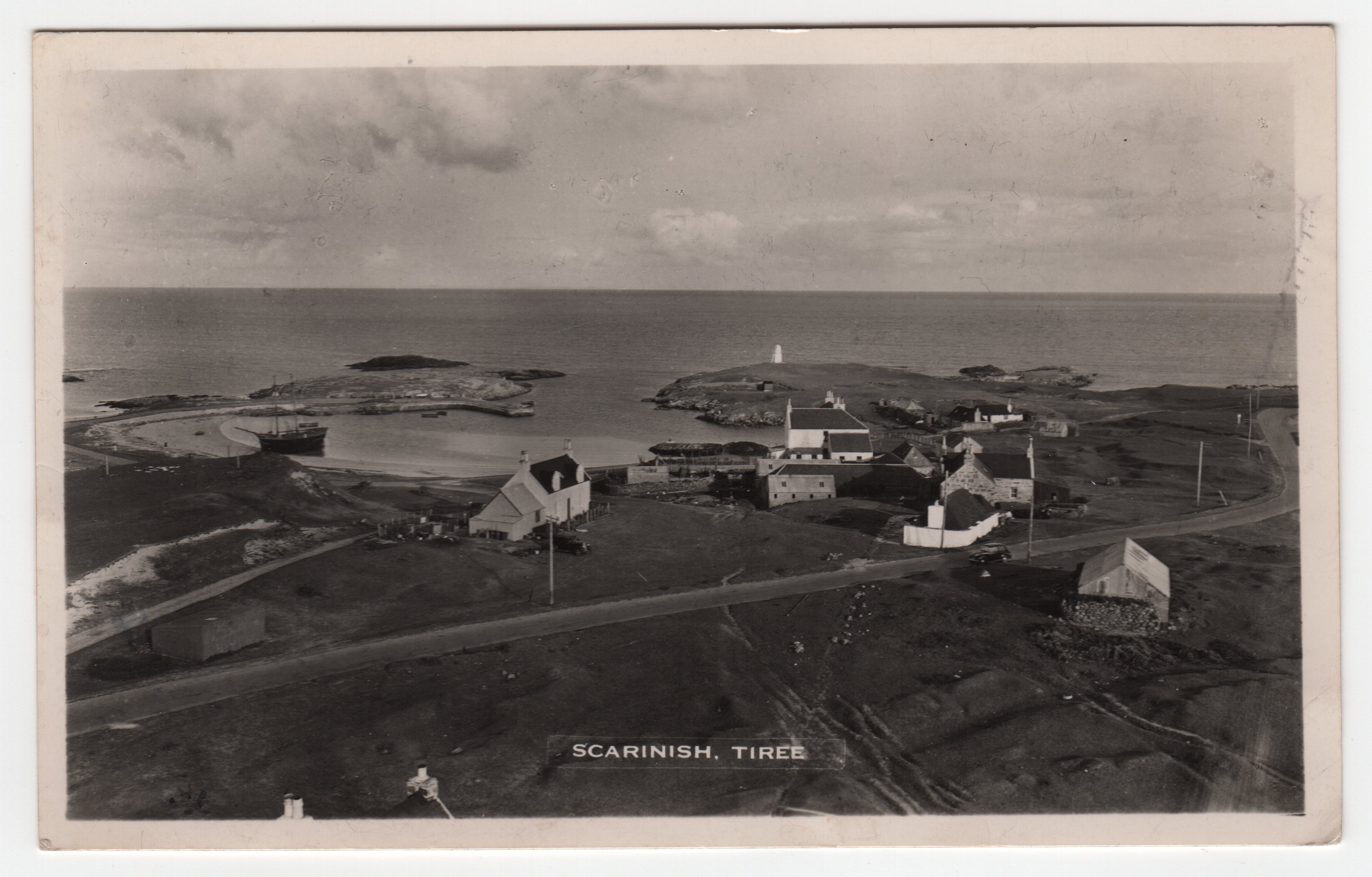 Black and white photograph of Scarinish and the harbour from a postcard sent from Scarinish Post Office to Devonport in July 1947. Handwriting reads “Having a wizard leave!! Weather wonderful. Time too short”.