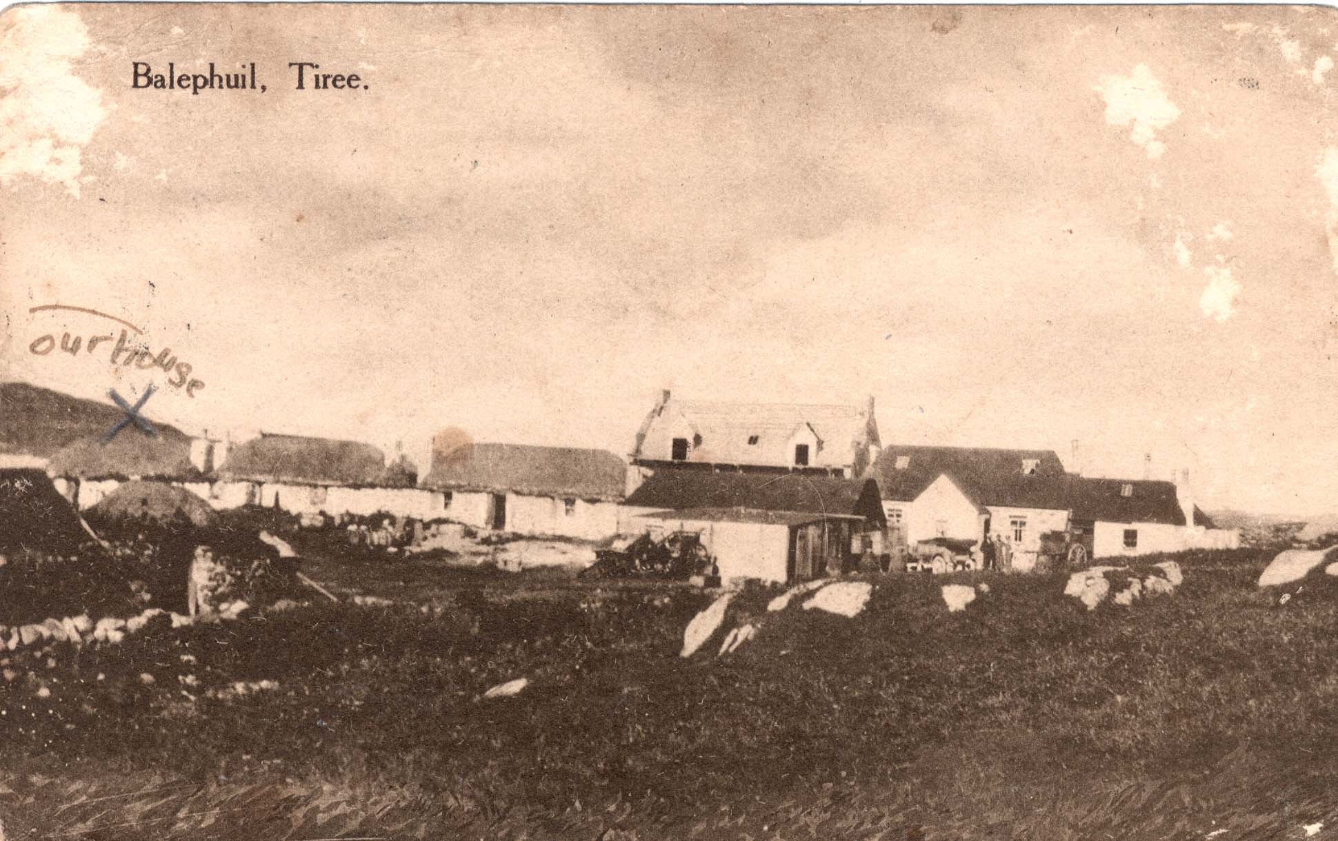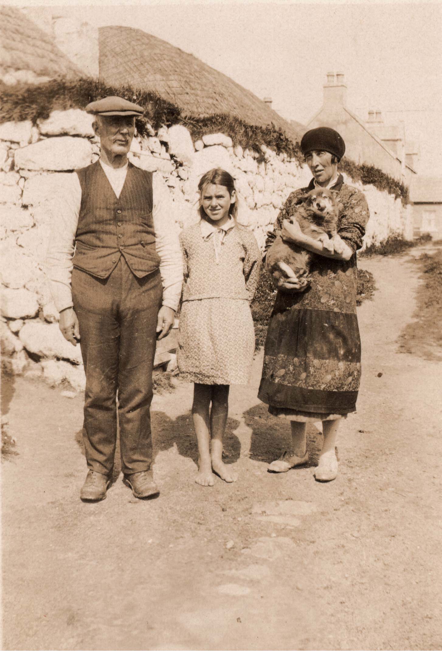 Taken outside the thatched house in Balephuil where Mary Flora and her husband Donald MacKinnon lived with Mary Flora`s father Archibald Campbell, c. 1915. L-R: John Kennedy (known as `Clever`), a neighbour, Mary Flora MacKinnon, the mother of the two children and Archibald Campbell. Both men were blind. `Clever` travelled around the world in sailing ships and had the second sight. Donald and Mary Flora emigrated to New Zealand in 1927.