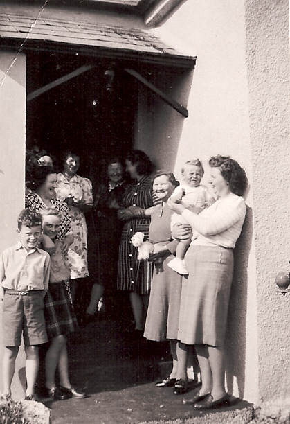 Black & white photograph of a family gathering of MacFadyens and Campbells in the door way of a house (`TheBungalow?) at Kenovay, around 1960. Includes Flora MacFadyen, Lizzie MacMaster (Cnoc Gorm, Kenovay), Vera MacFadyen, Mabel Campbell, Fiona & Neil MacFadyen, Margaret Nixon (nee MacFadyen) and her son Alan. (Original stored in filing cabinet 9 drawer 3)