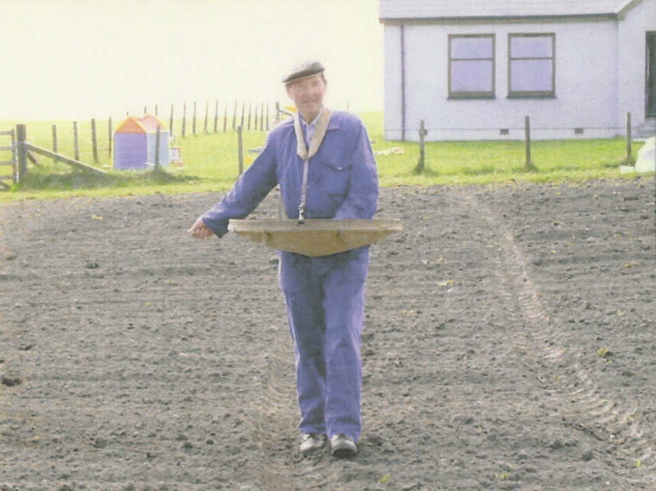 Lachie MacLean of Kenovay demonstrates in 2003 how seed was sown using a ‘basgaid churachd’. Sowing was a skilled job and not everyone could produce an even spread of seed. Unlike walking, the right arm is flung out as the right foot goes forward.