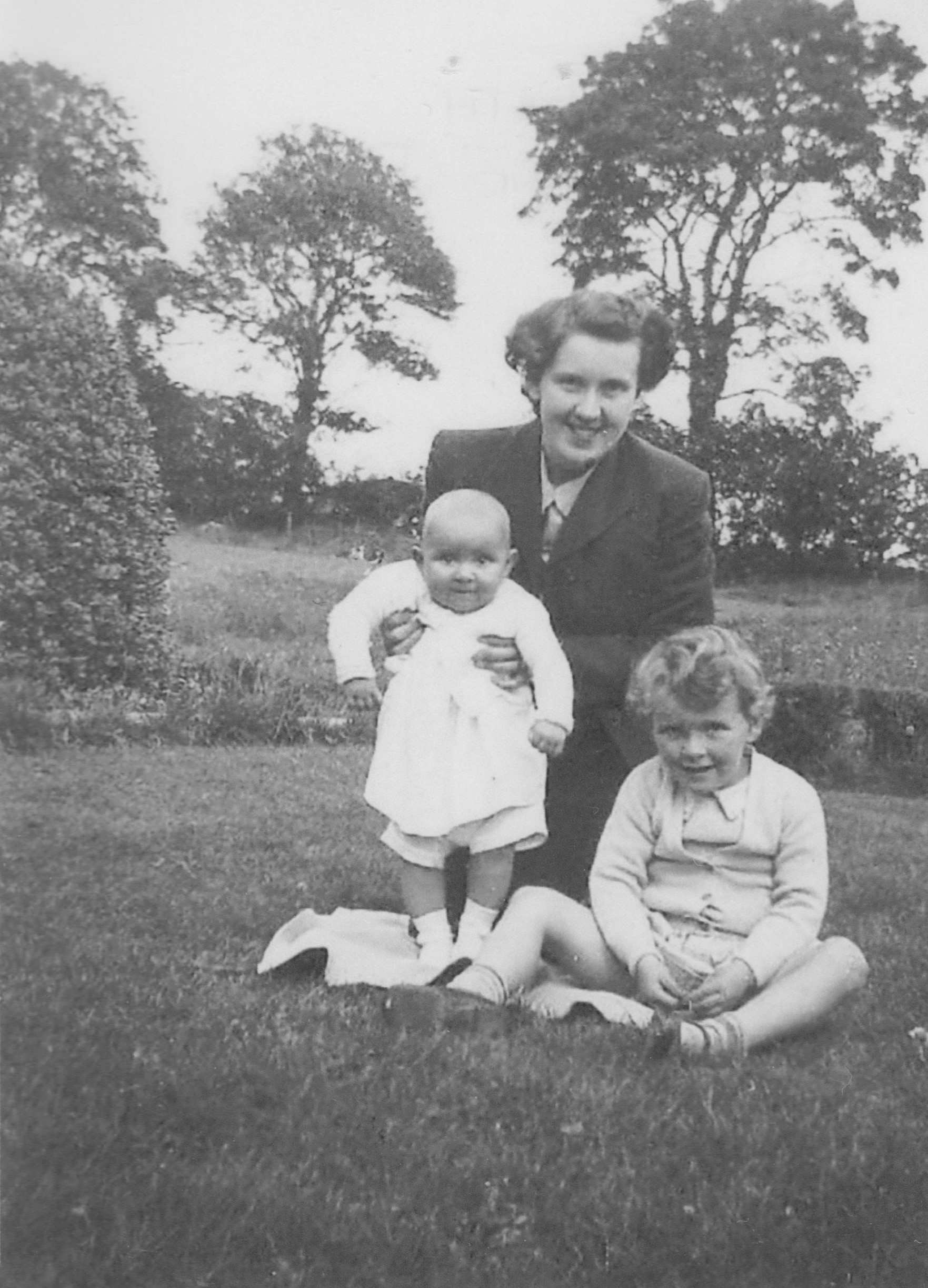 Black & white photograph of Mairi MacPhail, Kirkapol, with Diane and Janine, in around 1948. Mairi is the daughter of Neil and Chrissie MacPhail, Kirkapol.