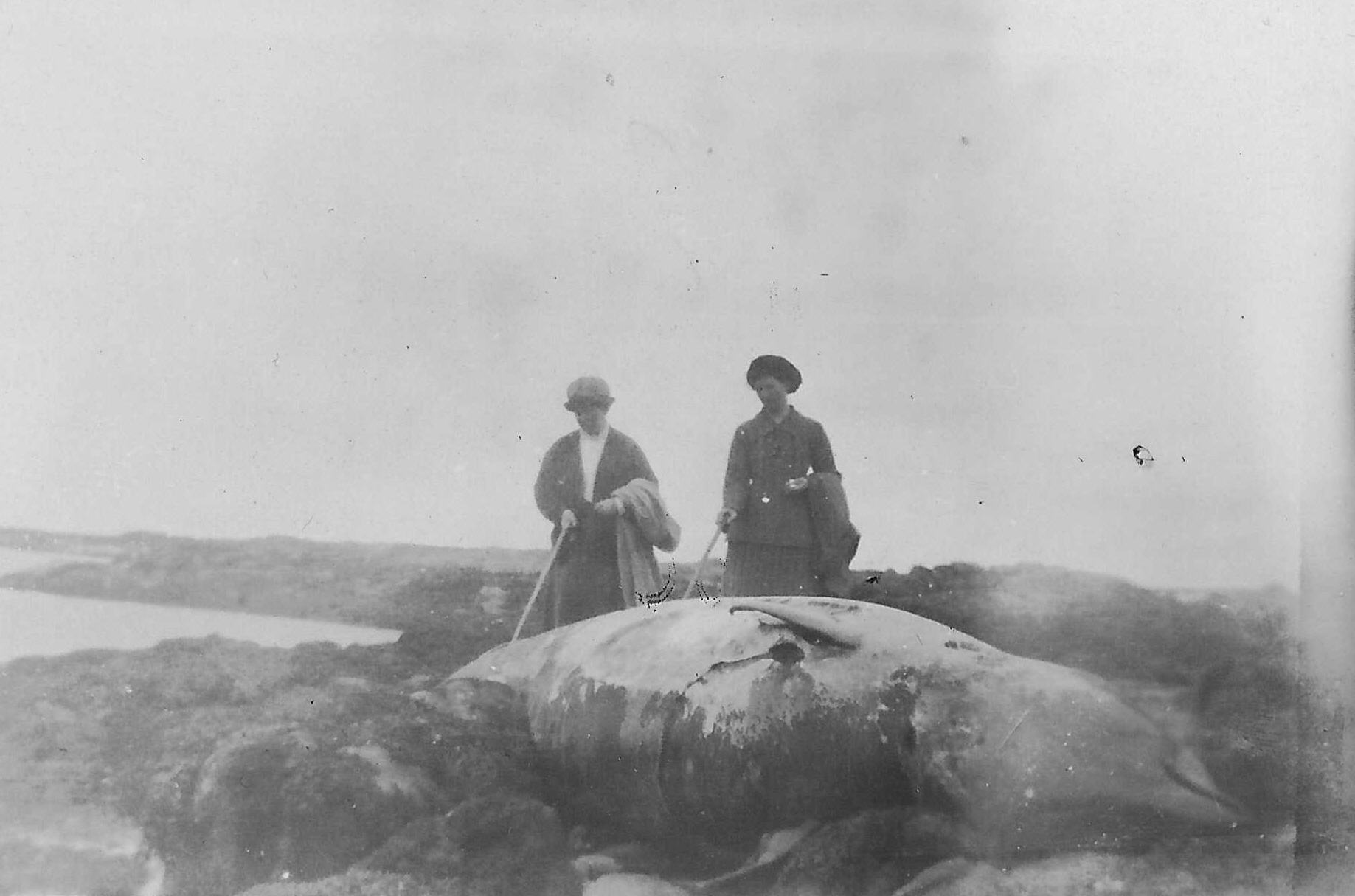 Black and white photograph of two unknown women and a dead whale from a small album from Silversands.