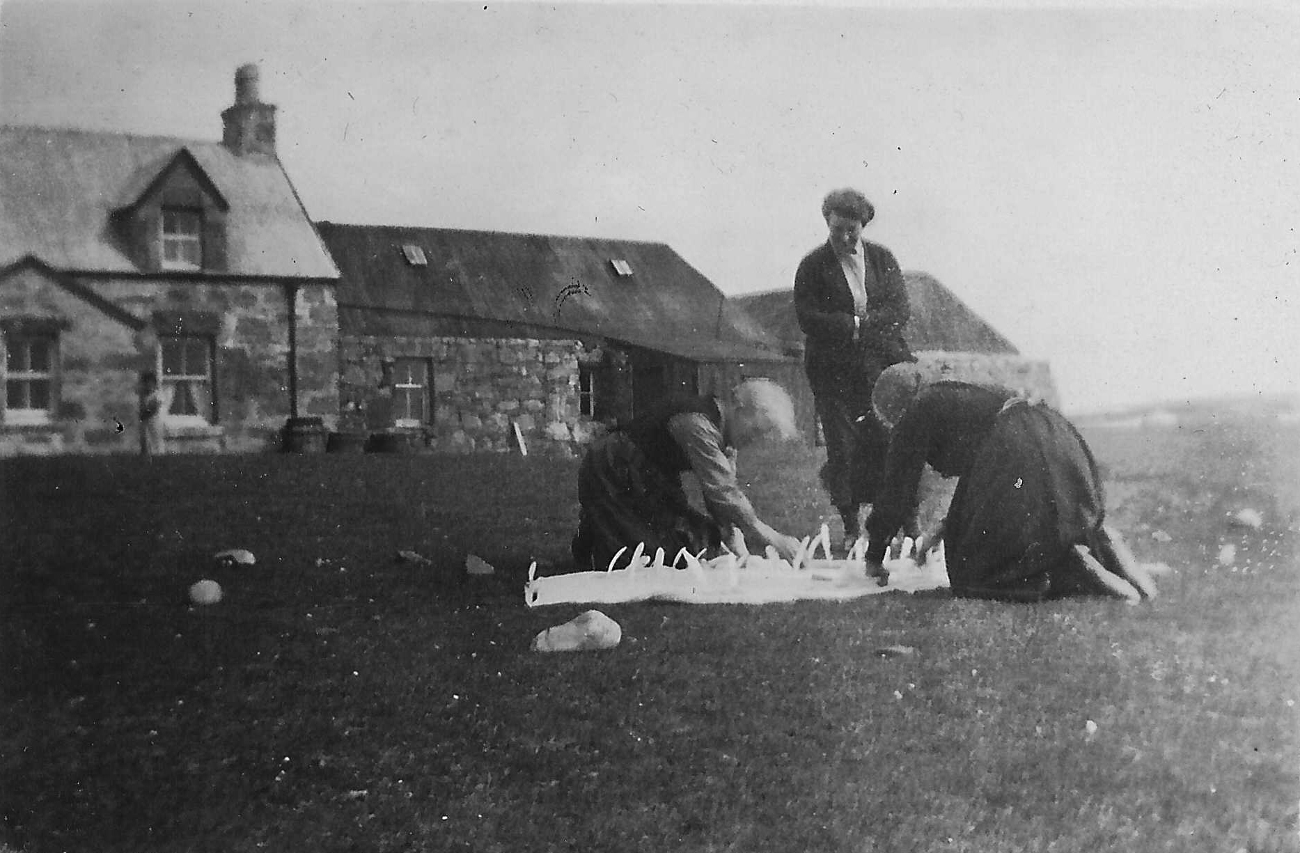 Three women pegging out what is probably a shawl on the grass to dry using feathers, from a small album from Silversands, Vaul, titled `Idle Days` probably dating from the 1920s or early 1930s.