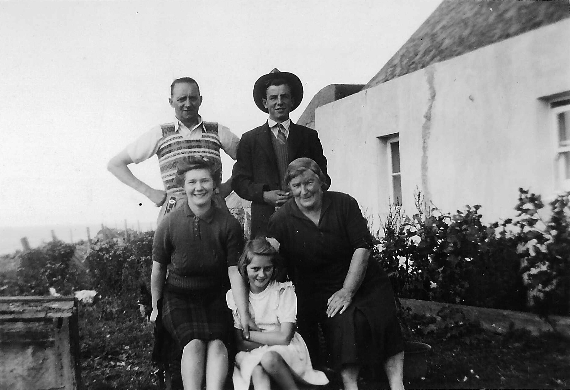 Rhum View, Vaul in 1945. L-R: (back) Harry Johnston (Margaret`s father), Iain MacKinnon (Catriona`s grandson), (front) Nan MacClounnan, Margaret Doig nee Johnston, Catriona MacKinnon (Margaret`s aunt). Catriona`s sister Mary Flora married Jimmy Pettigrew, the brother of Harry Johnston`s wife.